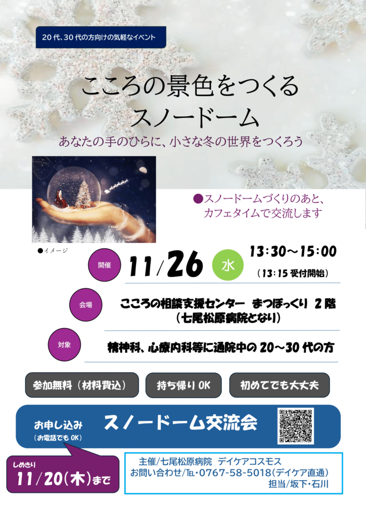 七尾松原病院デイケア「コスモス」では、精神科・心療内科などに通院中の20~30代の方を対象に、「スノードームづくり」を通じて交流を深めるイベントを開催します。